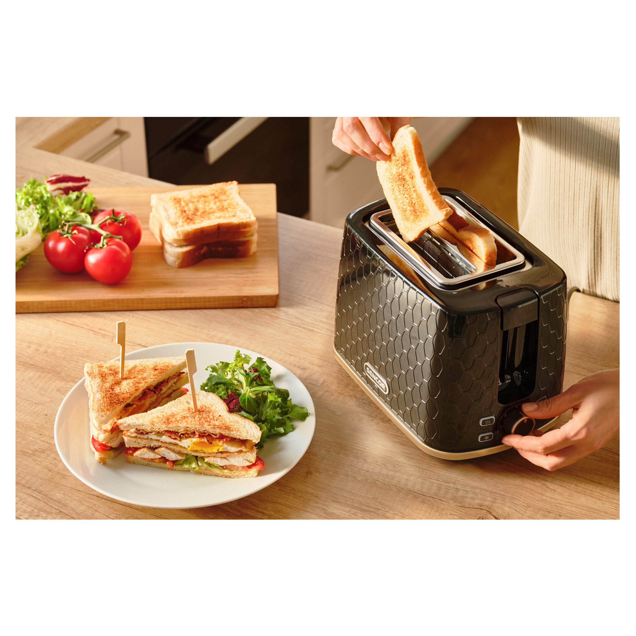 A Sencor STS 7501BK kenyérpirító praktikus funkciókkal rendelkezik, mint például a kenyér automatikus középre történő igazítása, amely lehetővé teszi a kenyér vastagságának kiválasztását. Ezenkívül képes automatikusan kiolvasztani, majd egyetlen folyamattan befejezni a fagyasztott péksütemények sütését. Praktikus a High Lift funkció, a pirítókosár úgynevezett magas emelése, amely biztosítja a még kisebb kenyérszeletek pirítását és egyben megkönnyíti a maradék részek eltávolítását.