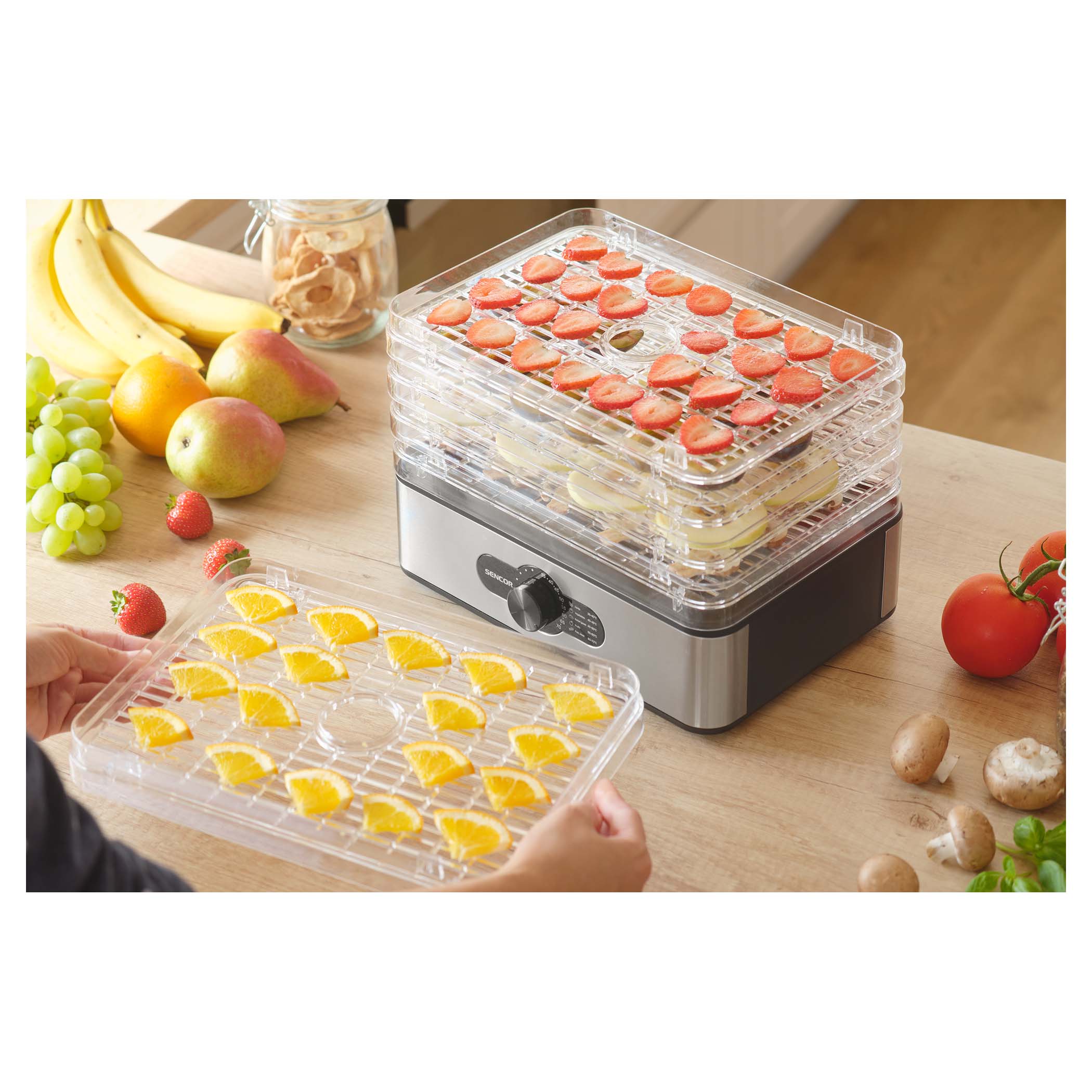 A Sencor SFD 950SS aszaló 5 db szárító tálcával rendelkezik. A tálcák 29 x 20 cm mérettel rendelkeznek és a szárítási szintek manuálisan állíthatók (16 vagy 29 mm). Segítségével különböző aszalt gyümölcsöket, gyógynövényeket, gombákat, húsokat vagy akár halakat száríthatunk. A beépített ventilátor gondoskodik az egyenletes szárításról mindegyik szinten, a szárító sziták rácsának kialakítása pedig megakadályozza a penész keletkezését és optimalizálja a légáramlást. Az átlátszó borítás lehetővé teszi a szárítási folyamat teljeskörű ellenőrzését.