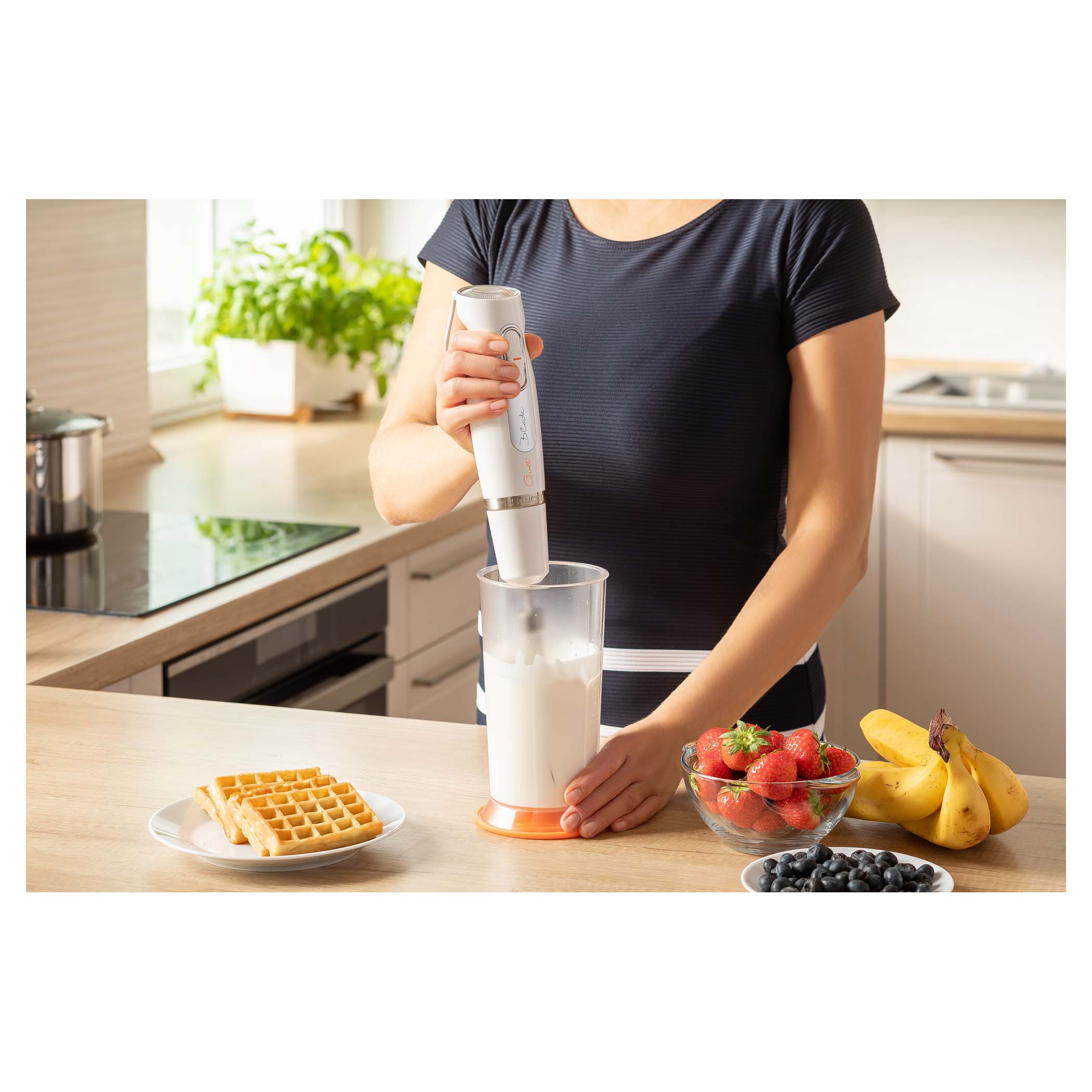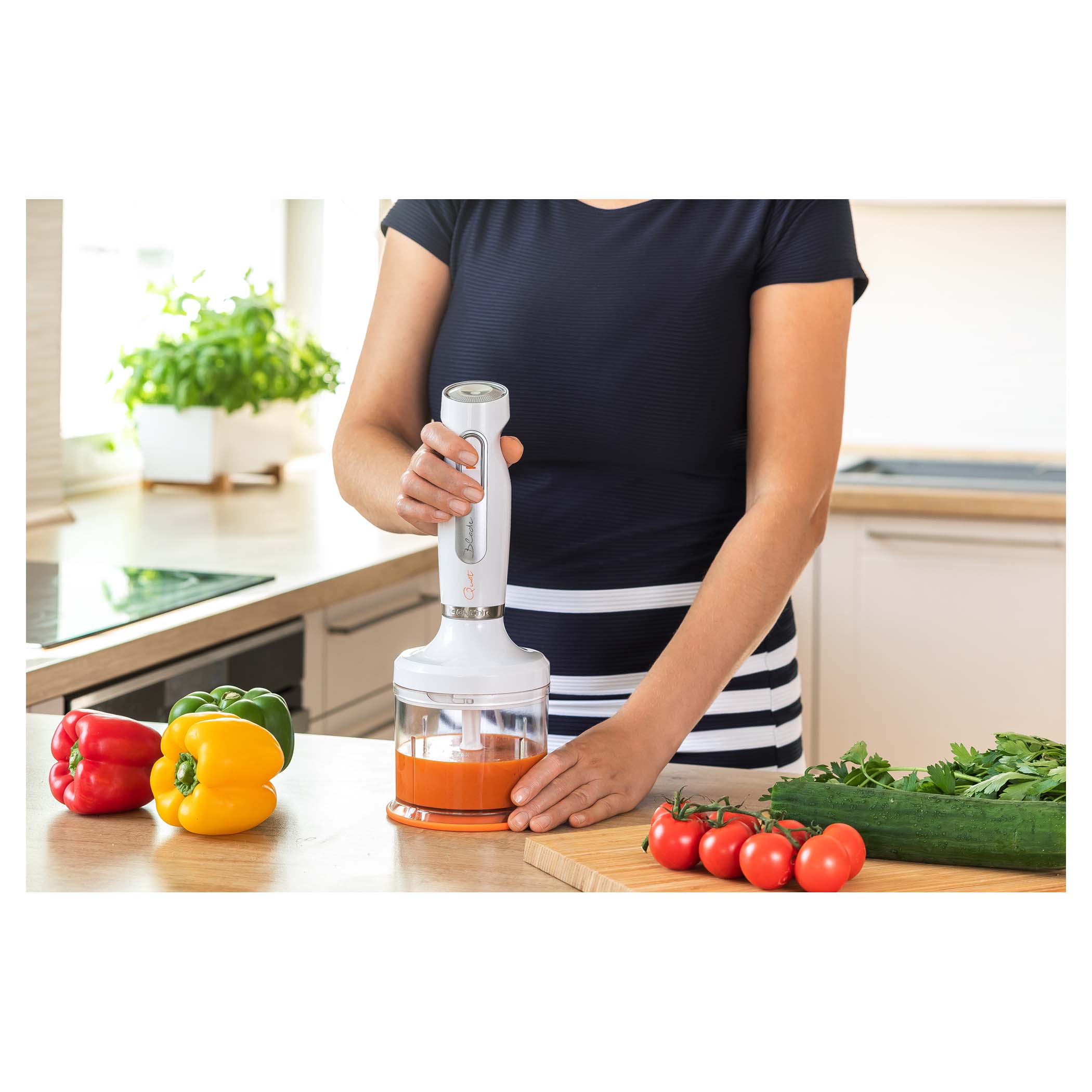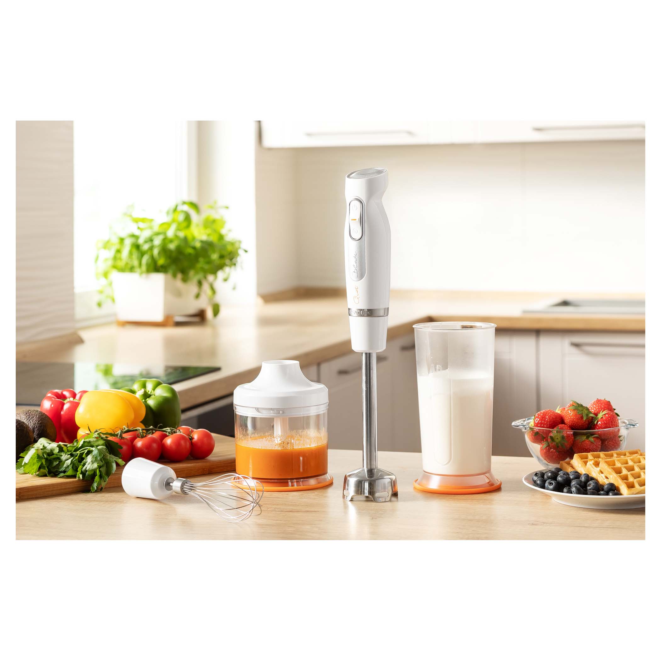A készülékhez több különböző fejet lehet rögzíteni. Az egyik turmix fejjel, szinte bármit össze tud mixelni, például kisebb harapnivalókat, lágy gyümölcsöt és zöldséget. A finom krémes levest pürésítse még főzés közben, vagy készítsen bármilyen italt felfrissülésére vagy fitneszre. A rozsdamentes acél fej négy élű minőségi késsel van ellátva.