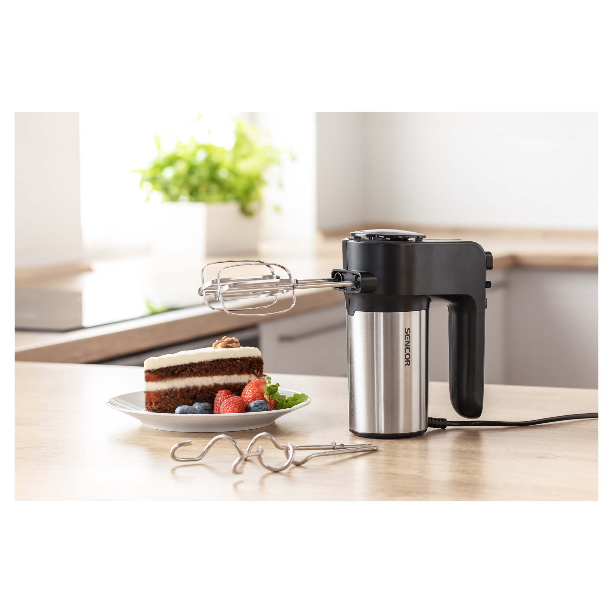 A Sencor megbízható 400 W-os motorral szerelte fel a készüléket, amely könnyű és csendes. Ennek köszönhetően öt sebességfokozat közül tud választani, és még a TURBO funkciót is. Egy pillanat alatt hatékonyan keveri össze a sűrűbb, de finom összetevőket is, például különféle süteménytészták, mindenféle krémek, tojásfehérje, tejszínhab vagy akár zabkása elkészítésére is alkalmas.